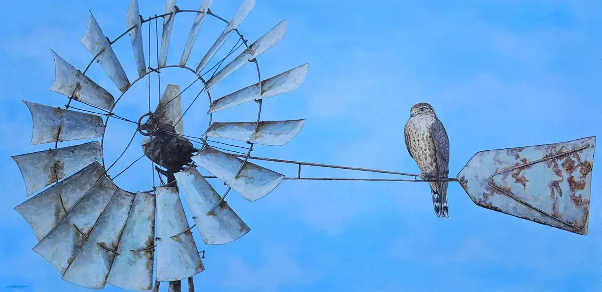 Martin Kotyluk "Wind Pump Merlin Perched" 24" x 48", Acrylic